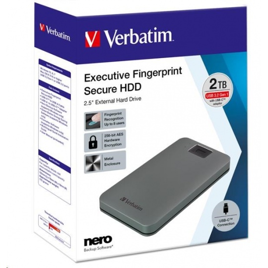 VERBATIM externí HDD 1TB, Executive Fingerprint Secure, USB 3.2 Gen 1 / USB-C, šedá