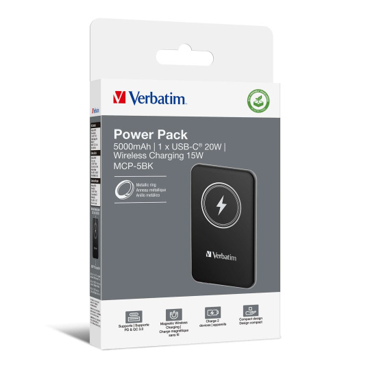 VERBATIM Powerbanka Charge 'n' Go, Magnetická, 5000 mAh, USB-C, Černá