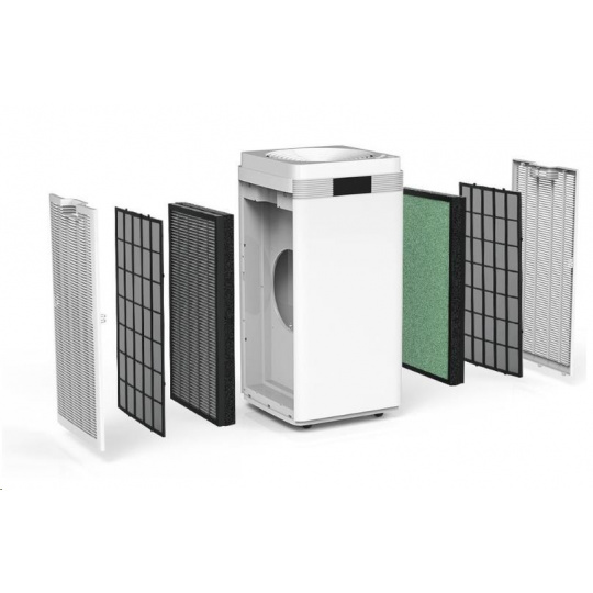 - Složení filtrační sady: 2x sada separátních filtrů se 4 stupňovou filtrací, 1) základní filtr, 2) HEPA filtr, 3) Uhlíkový filtr, 4) Ionizer