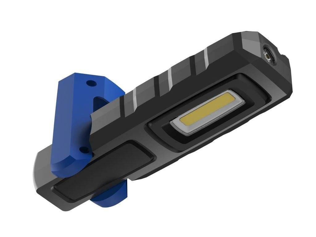 - Praktické možnosti uchycení: Baterka je vybavena háčkem na horní části pro snadné zavěšení, magnetem na spodní straně pro připevnění k kovovým povrchům a ohebným držákem, který umožňuje postavení baterky do požadovaného úhlu.