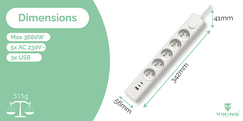 Prodlužovací zásuvka Viking YC53 nabízí skvělou flexibilitu a výkon díky 5 AC výstupům a 3 USB portům, které umožňují nabíjení až 8 zařízení současně. S praktickým tlačítkem ON/OFF a 1,5 m dlouhým kabelem je ideální pro použití ve vaší domácnosti i kanceláři.