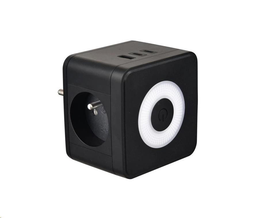 Viking síťový adaptér Y23L, 2x 230 V, 1x USB-A, 2x USB-C, dotykové světlo, černá