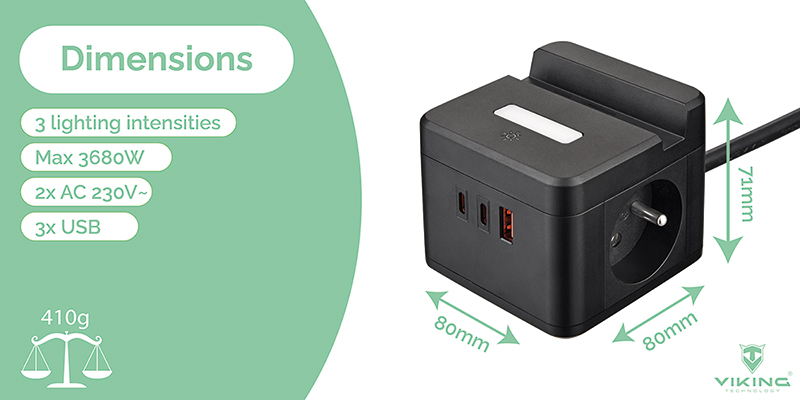 Síťový adaptér VIKING YC23H kombinuje dva AC výstupy, tři USB porty, což umožňuje nabíjení až pěti zařízení současně. Je vybaven držákem na mobilní telefon a dotykovým světlem se třemi úrovněmi svícení, zajišťujícím pohodlné a efektivní používání doma i v kanceláři.