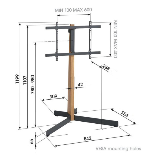 Vogel's TV 40-77'', natáčení ±45°, VESA 600x400 mm, výška středu VESA 780-980 mm, 50 kg, dub + černá ocel