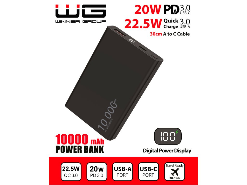 WG - Power Bank 10000 mAh, USB-C PD 20W + USB-A 22.5W, černá