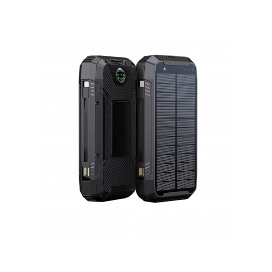 - Solární nabíjení: Solární panel umožňuje dobíjení powerbanky pomocí sluneční energie, ideální pro outdoorové aktivity nebo nouzové situace.