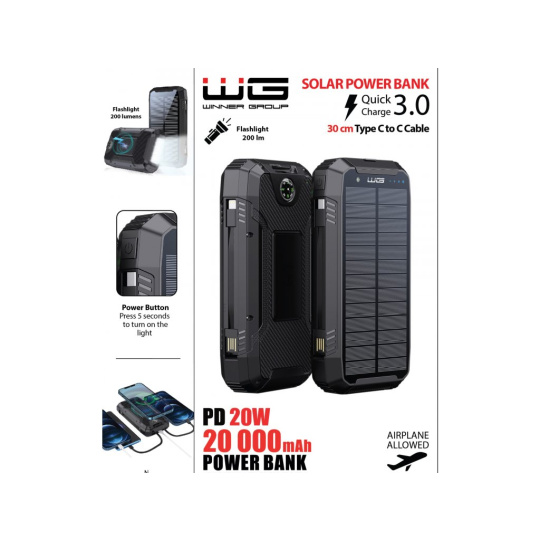 WG - Power Bank 20000 mAh, solarní panel + bezdrátové nabíjení 15W + svítilna + kompas, USB-C PD 20W, černá