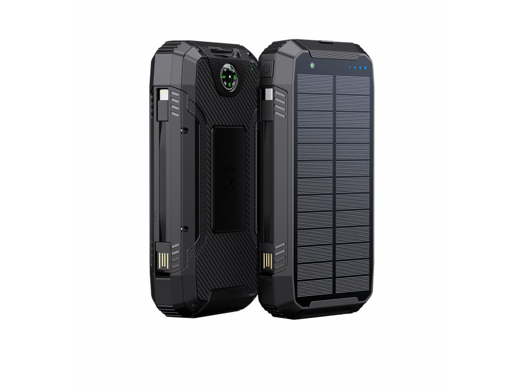- Solární nabíjení: Solární panel umožňuje dobíjení powerbanky pomocí sluneční energie, ideální pro outdoorové aktivity nebo nouzové situace.