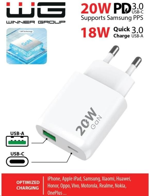WG - Síťová nabíječka 2x USB, 1x USB-C PD 20W + 1x USB-A QC3.0 18W, white