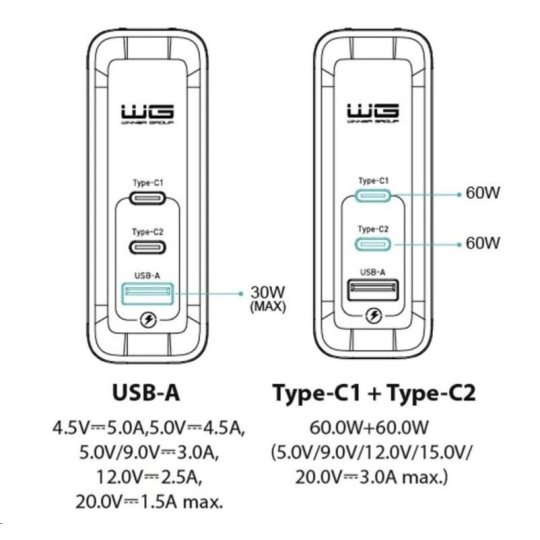 • USB-C1+USB-C2: 5V/9V/12V/15V/20V?3A max. (60W+60W)