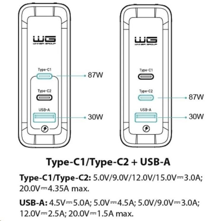 • USB-C1/C2 +USB-A: 5V/9V/12V/15V?3A, 20V?4.35A max (87W+30W)