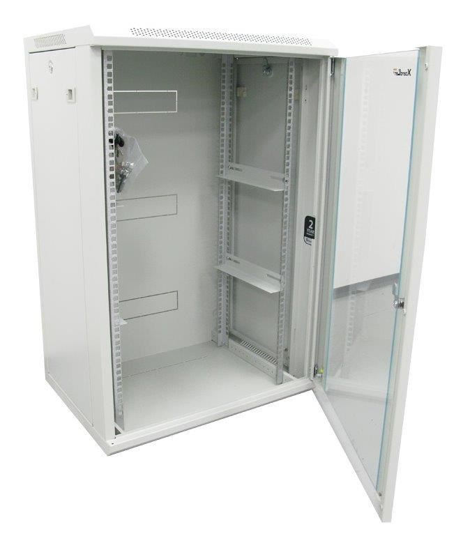 XtendLan 19" nástěnný rozvaděč 18U 600x600, nosnost 60 kg, skleněné kouřové dveře, rozložený, šedý