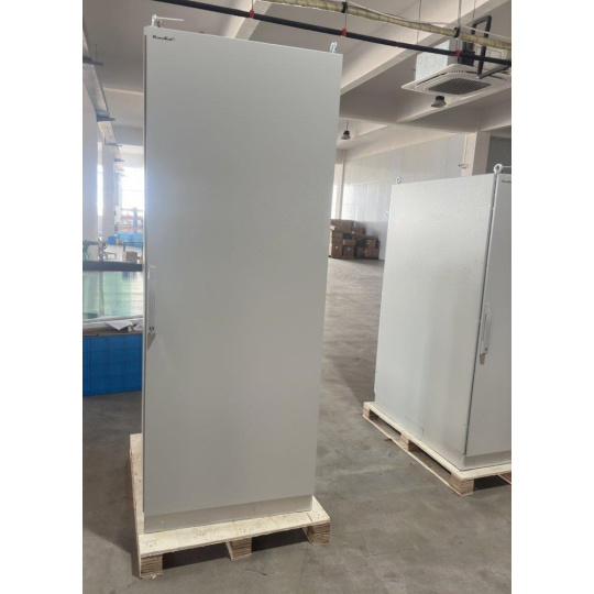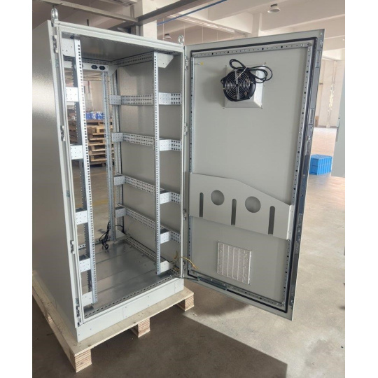 Rozvaděč pro instalaci datových a telekomunikačních zařízení, ventilace s termostatem, podstavec, šedý.