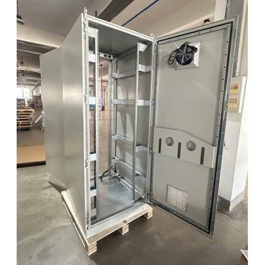 Rozvaděč pro instalaci datových a telekomunikačních zařízení, ventilace s termostatem, podstavec, šedý.