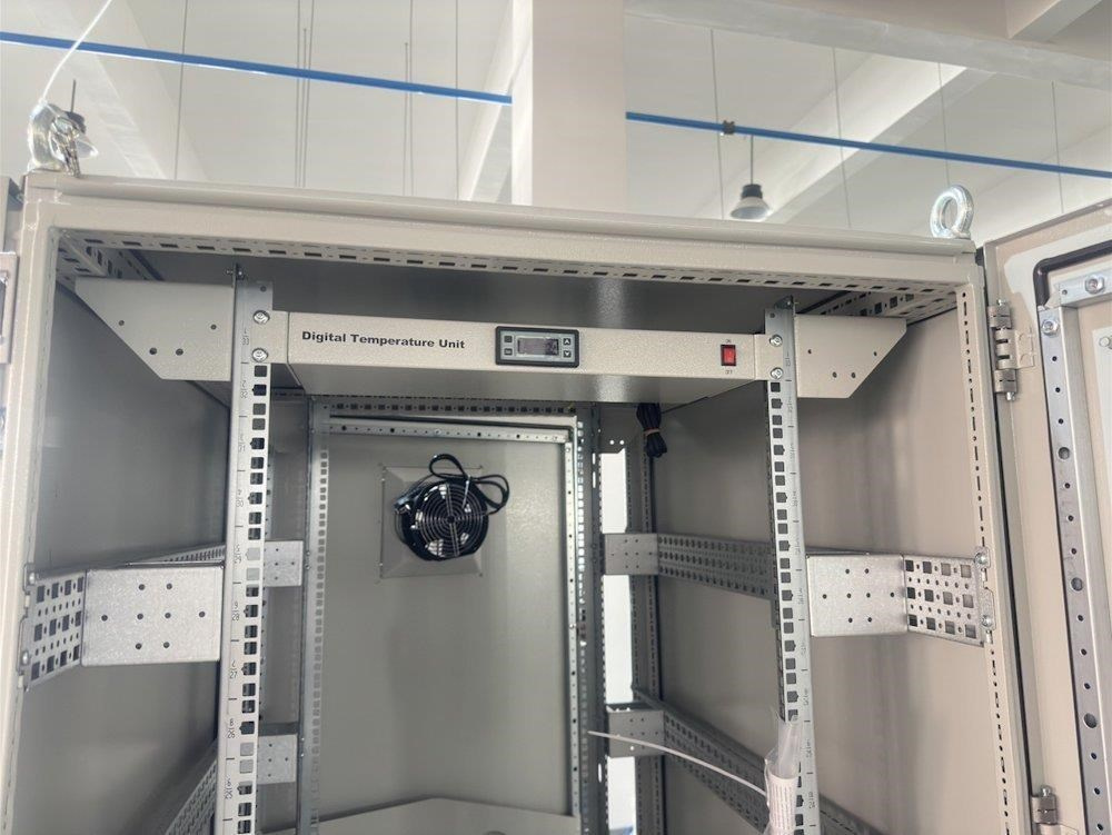 Rozvaděč pro instalaci datových a telekomunikačních zařízení, ventilace s termostatem, podstavec, šedý.