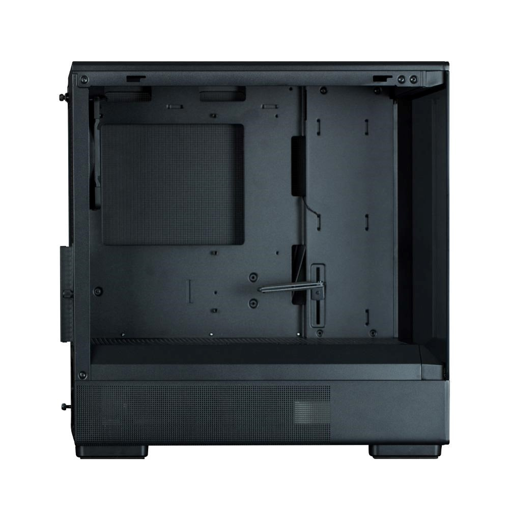 Dvě bezrámová přední a boční tvrzená skla zobrazující jedinečnou konstrukci PC