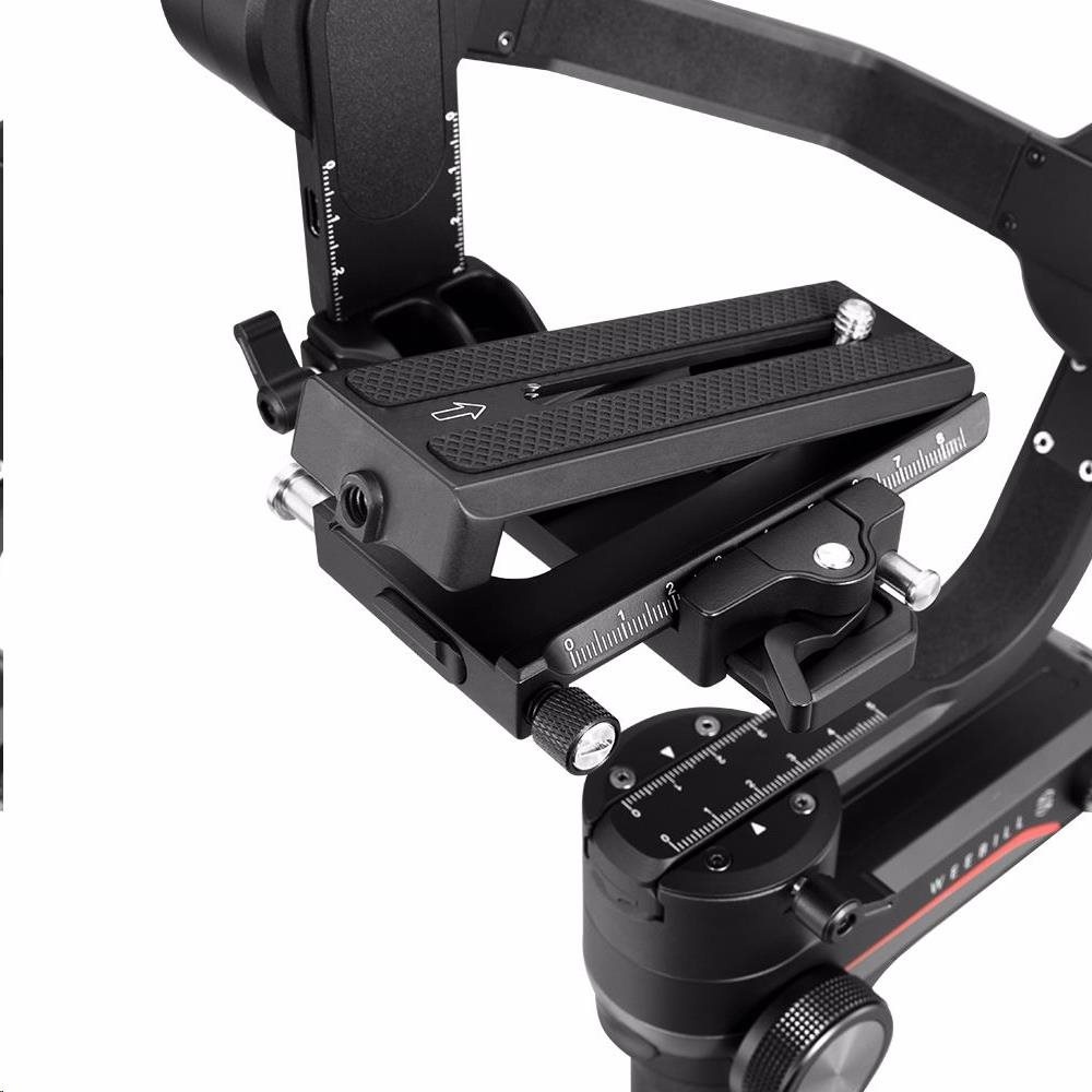 Weebill S používá rychloupínací destičku 2v1 (Arca Swiss i Manfrotto), což umožňuje snadnější nastavení a rychlejší přechod mezi zařízeními bez nutnosti opětovného vyvážení. Konstrukce západky umožňuje snadné uzamčení každé osy pro lepší vyvážení a snadnější složení stabilizátoru.